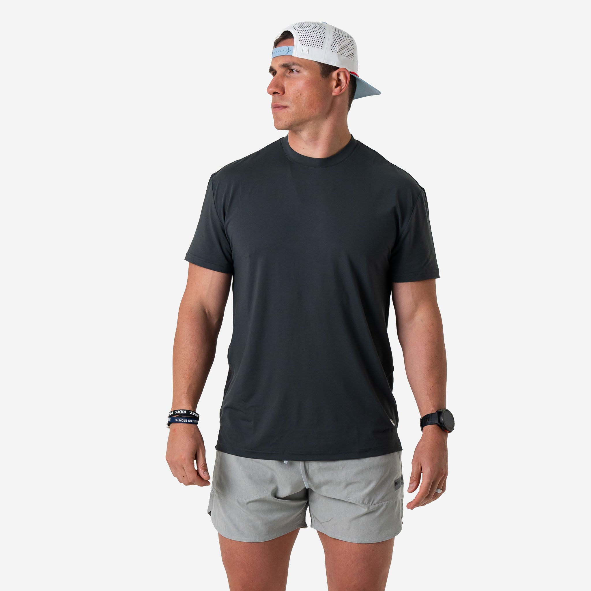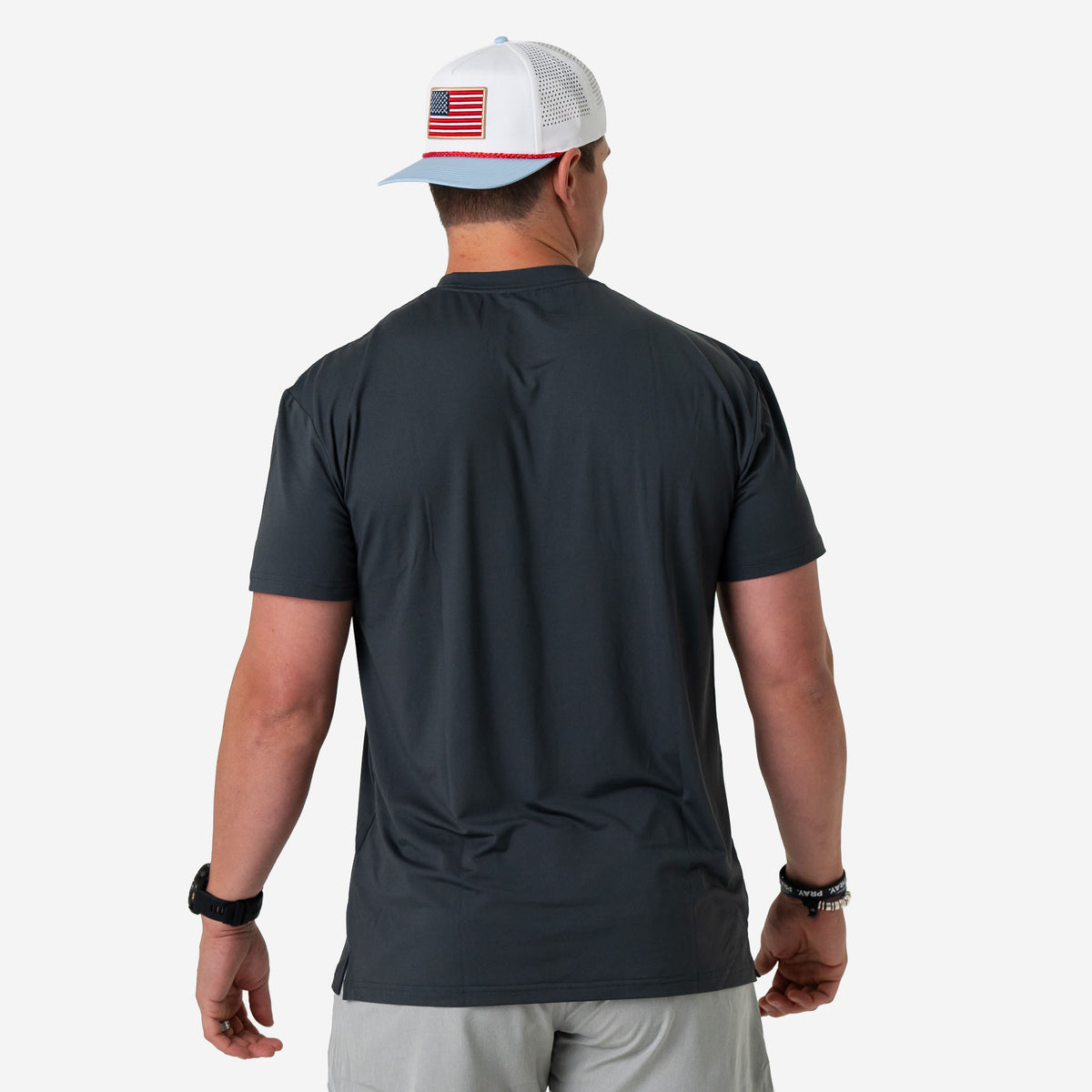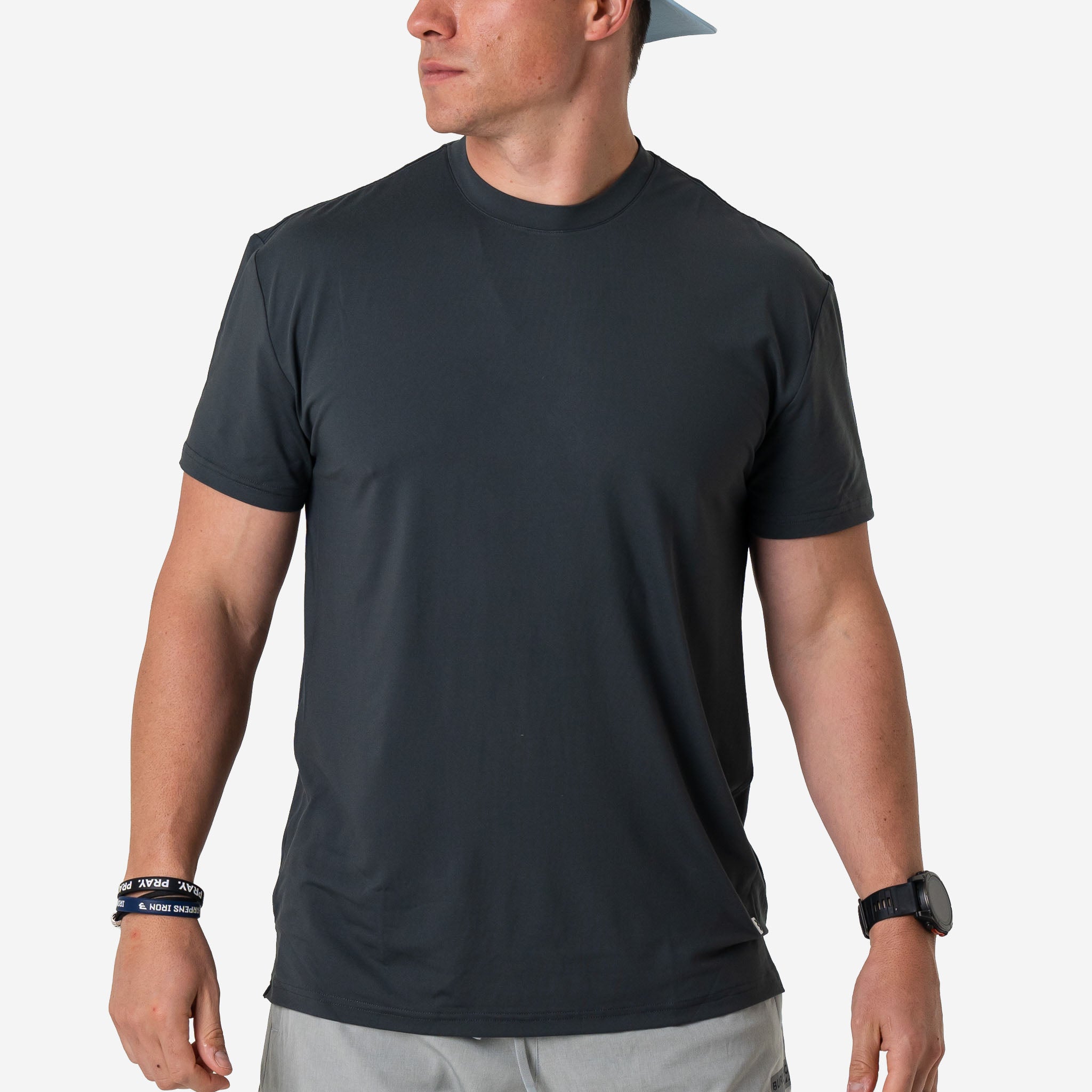Our "Go To Tee," the ultimate companion for your active lifestyle. Crafted from a blend of 91% polyester and 9% spandex, this tee offers superior comfort and performance, ensuring you stay cool and dry throughout the day. With UPF 50 sun protection, you can confidently take on outdoor activities while shielding your skin from harmful UV rays. The lightweight performance fabric is quick-drying and moisture-wicking, keeping you fresh and comfortable even during the most intense workouts. Featuring anti-microbial properties, this tee helps combat odor-causing bacteria, keeping you feeling fresh and confident all day long. Whether you're hitting the gym, going for a run, or simply running errands, our "Go To Tee" is the perfect choice for all your active endeavors.