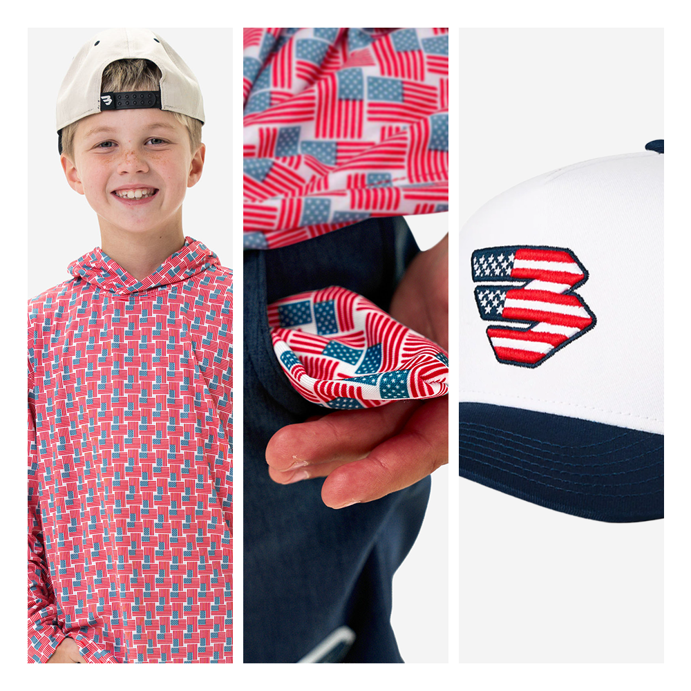 Includes Youth Performance Hoodie - American Flag Print, Youth Athletic Short - Heather Navy - American Flag Liner, and Youth Cap - Patriotic Flying B - Navy